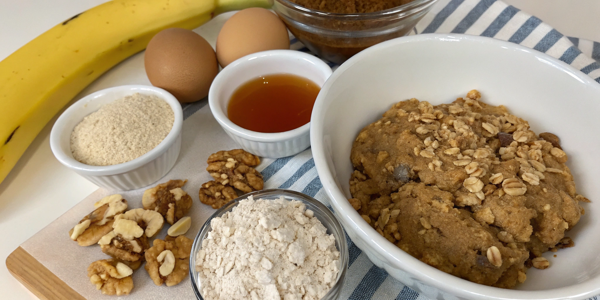- In a separate large bowl, mix the rolled oats, almond flour, baking powder, and salt along with chopped walnuts to distribute the dry ingredients evenly.