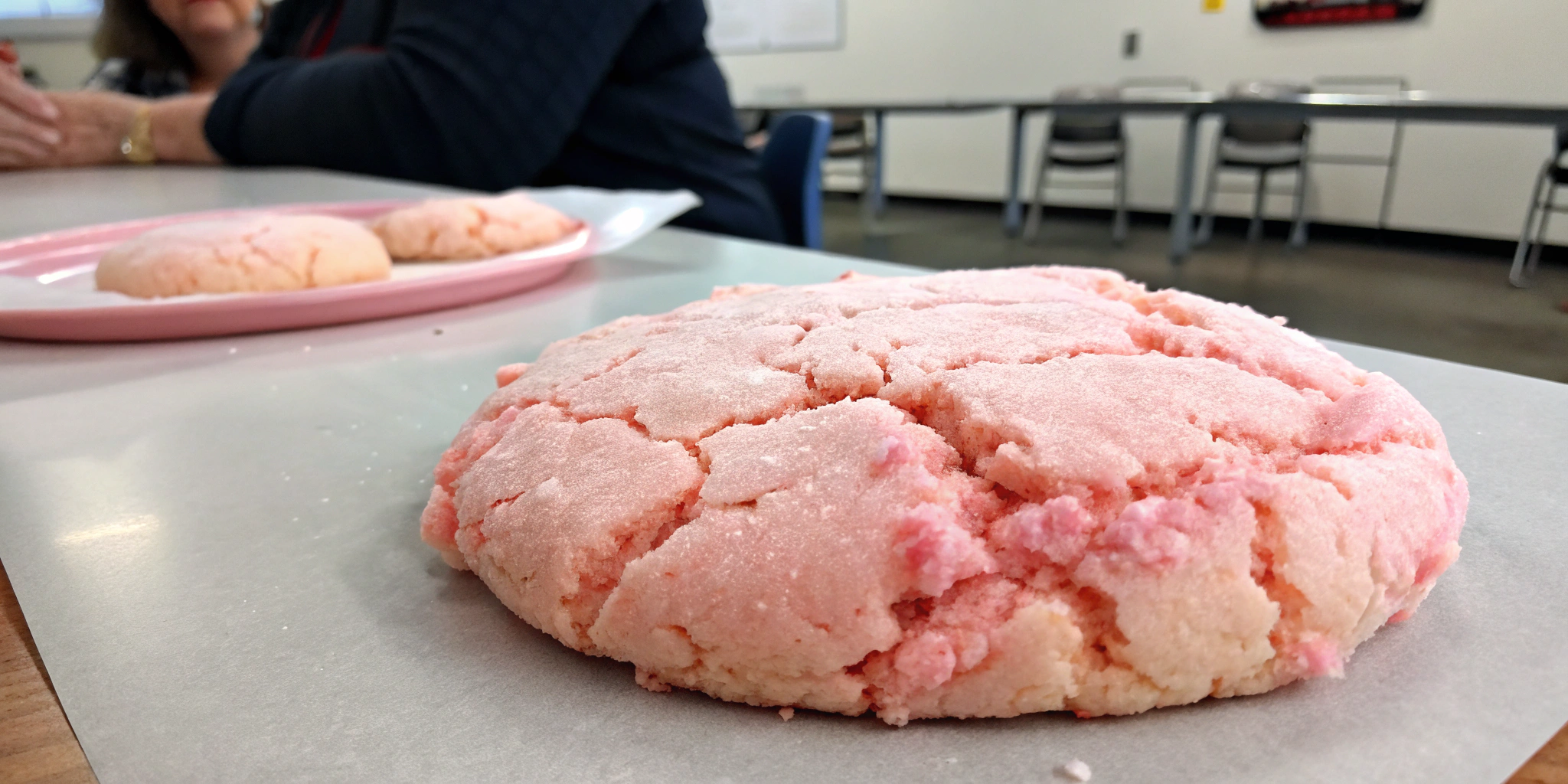 [IMAGE: Close-up shot of the soft, pastel pink cookies showing their delicate texture]