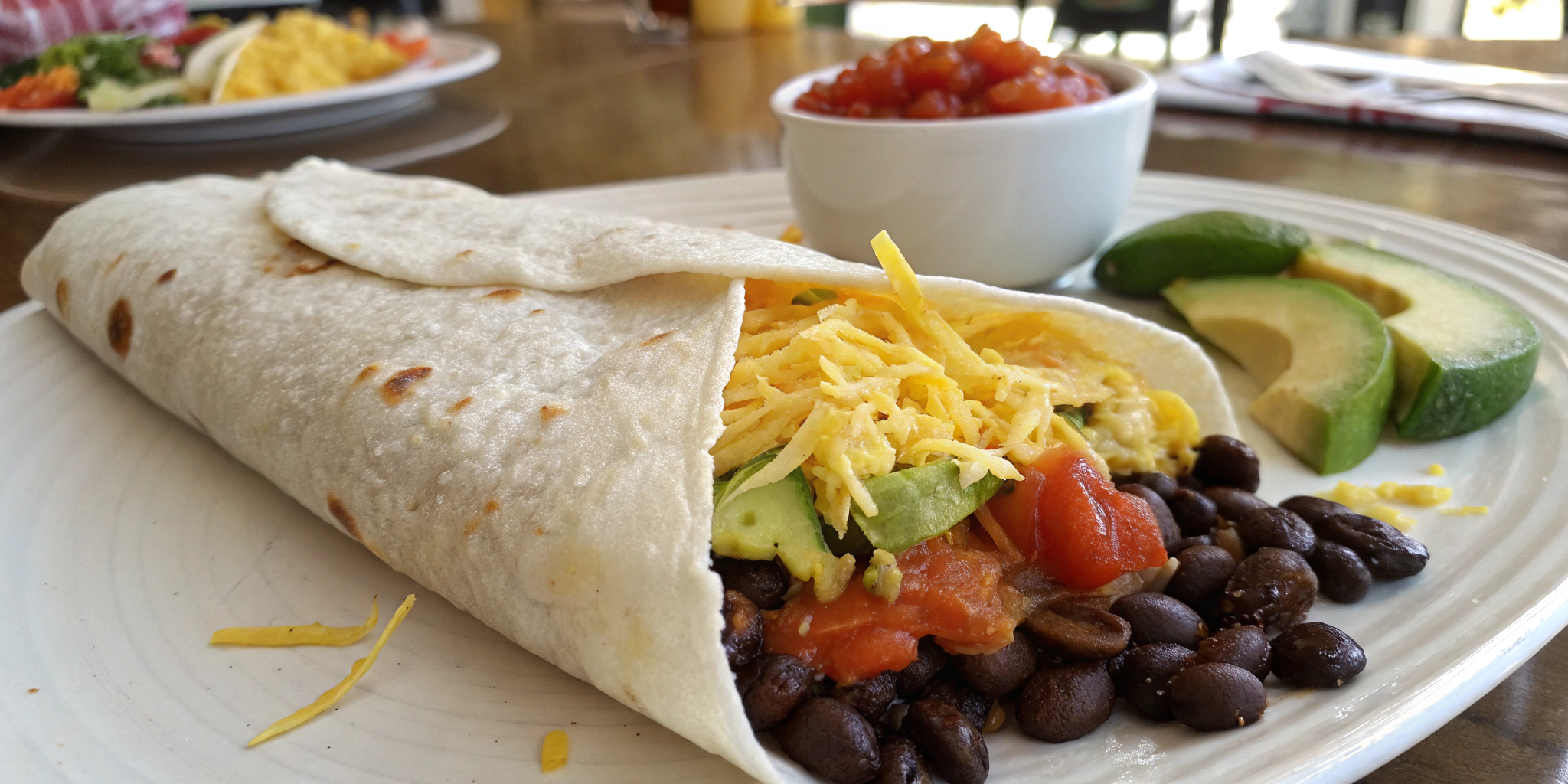 - Layer each tortilla with scrambled eggs and beans, shredded cheddar cheese, sliced avocado, and a drizzle of salsa. Roll up the tortilla tightly to enclose the fillings.