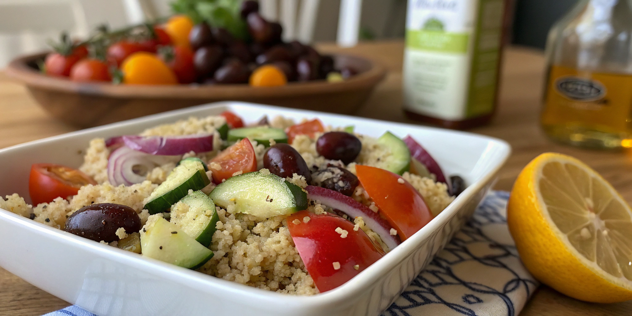 kcalThis vibrant Mediterranean Quinoa Salad is a quick, nutrient-packed vegetarian lunch perfect for busy days. With fresh seasonal vegetables and wholesome quinoa, it offers a burst of flavor and energy.